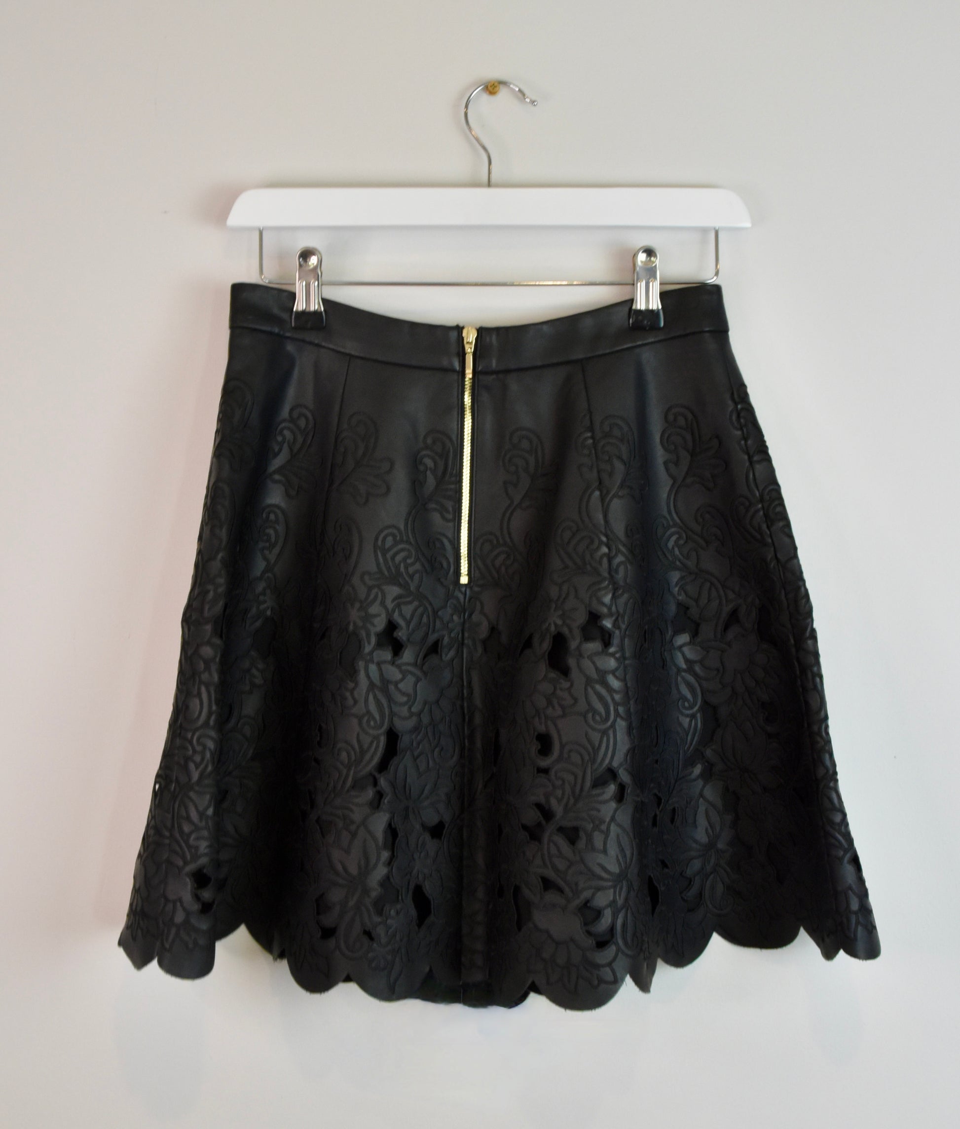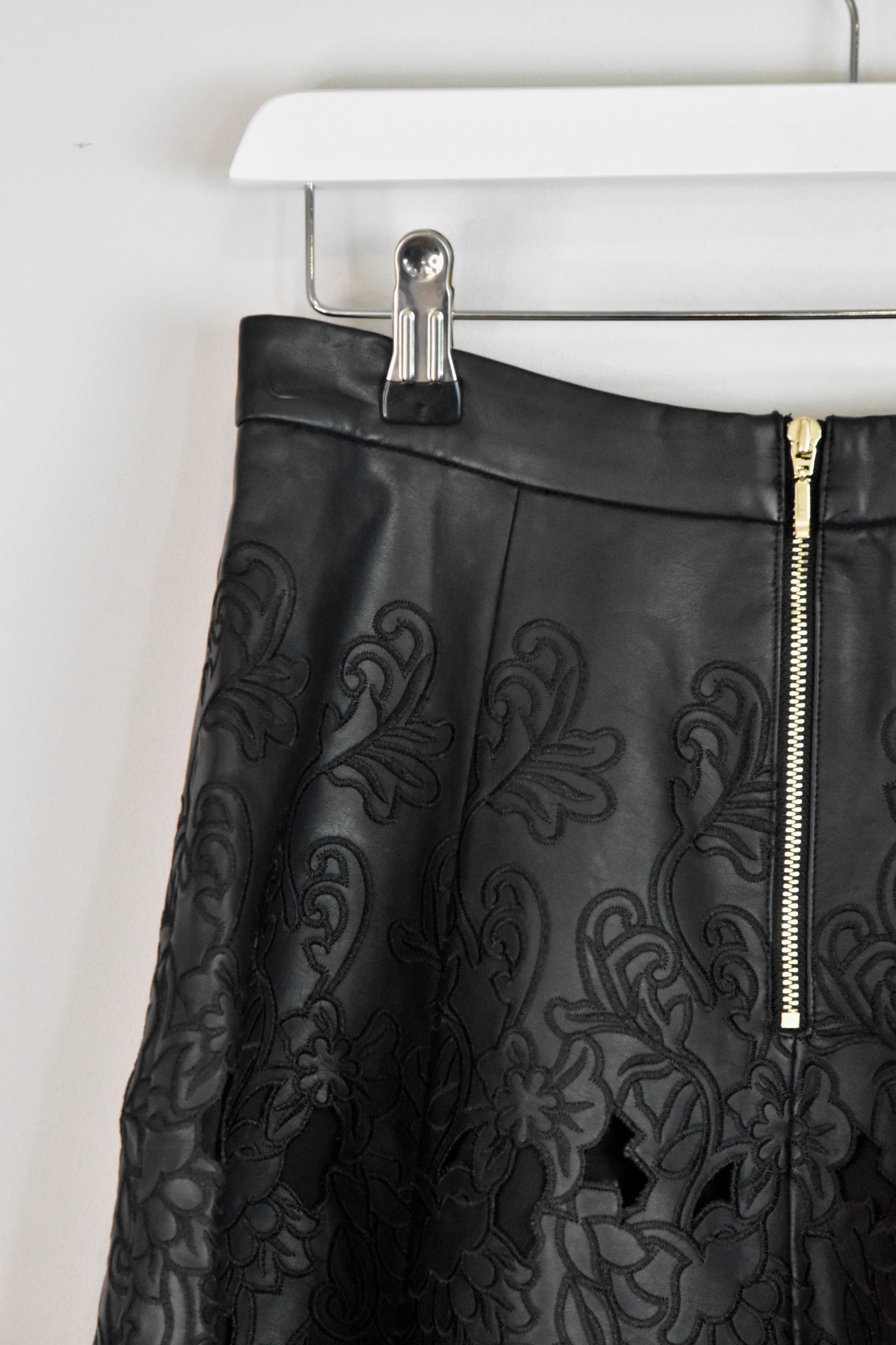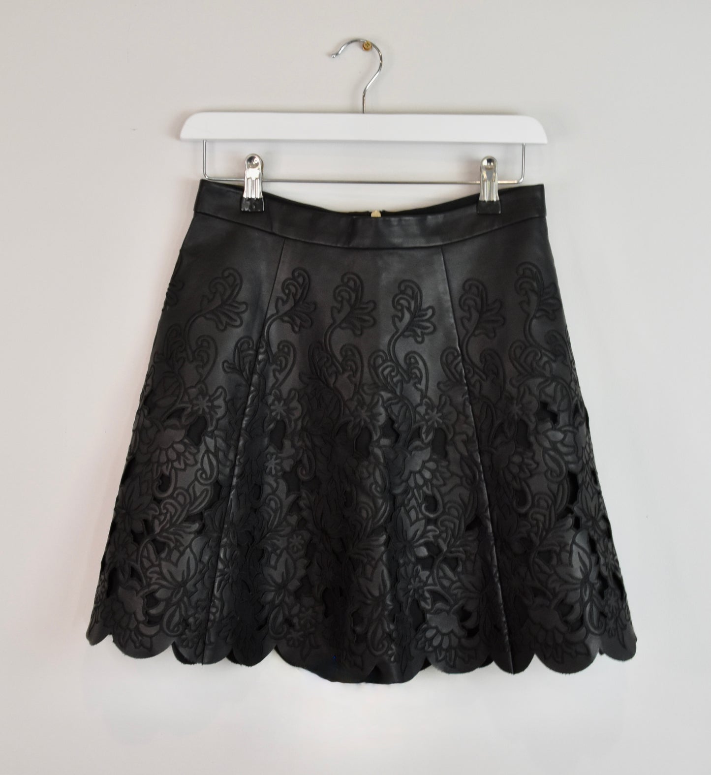 This amazing faux leather Club Monaco skirt is in fabulous pre-loved condition. A-line in style and with beautiful floral stencilling within the material makes this a real showstopper!