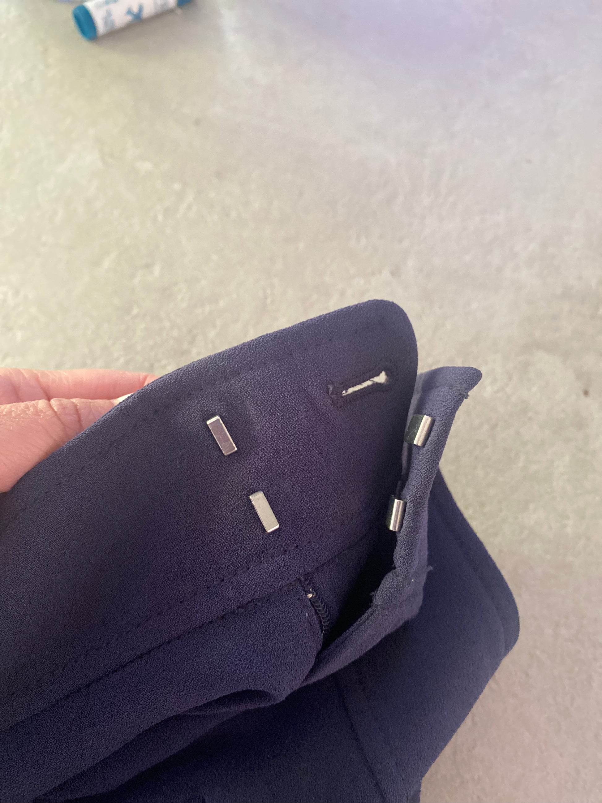 The button on the inner waistband is missing, however the trousers fasten just fine with the clasp at the top of the zip (see images)