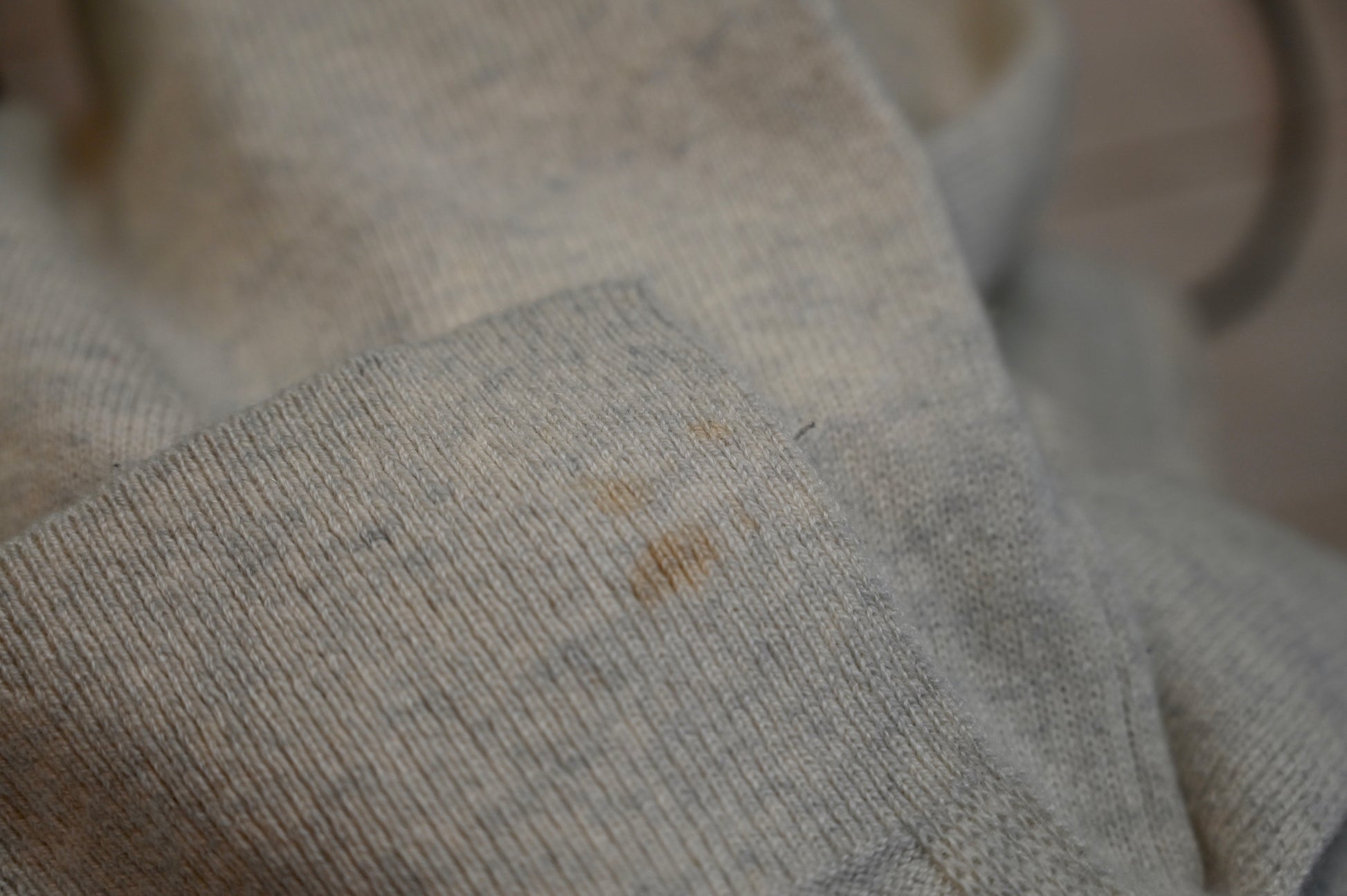 A Club Monaco classic cashmere lightweight jumper in stone with grey cuffs. There is a small mark on the inside of the jumper towards the bottom (see photo).