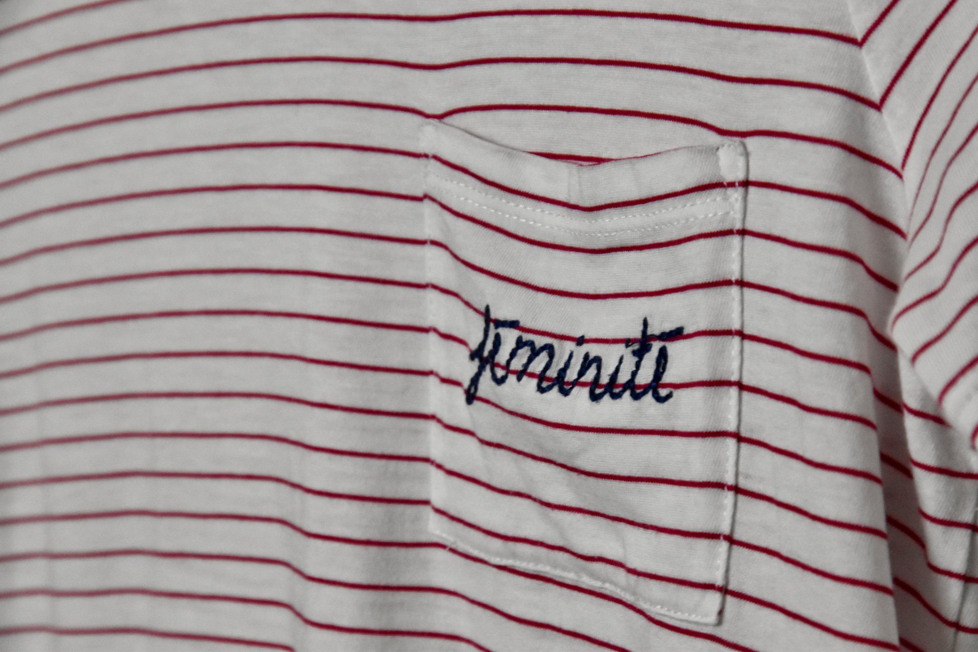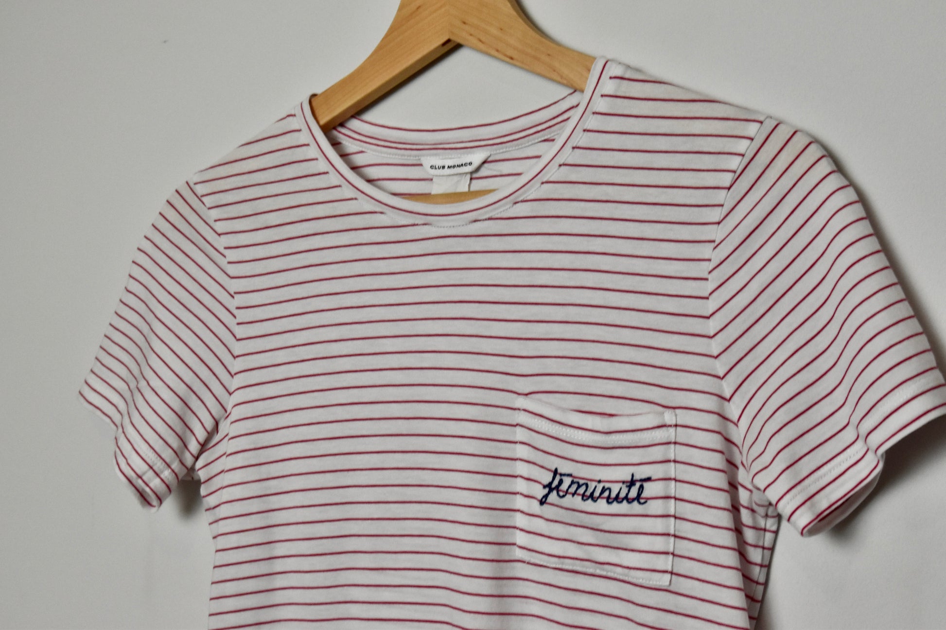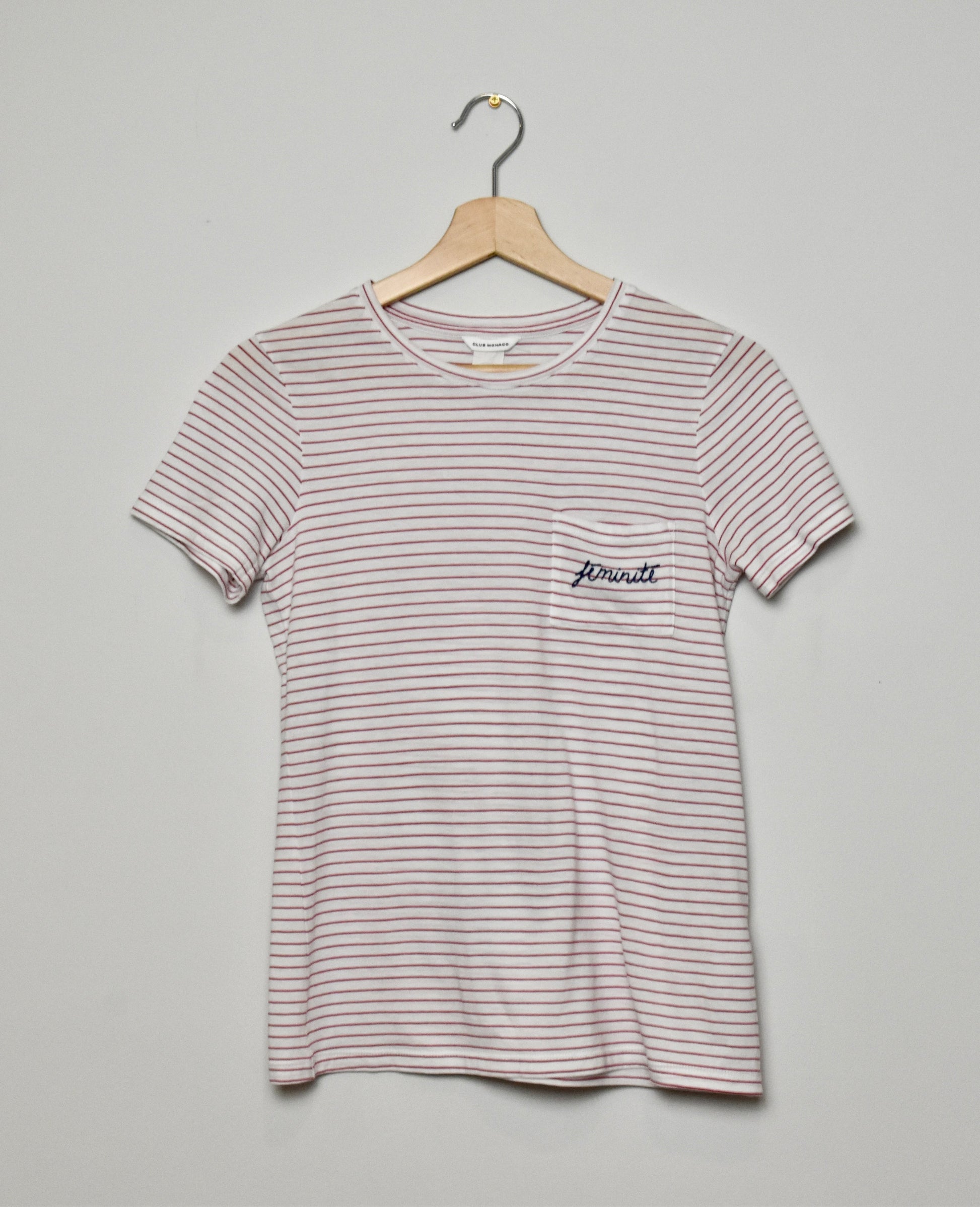 Get your hands on this fine red and white striped Club Monaco tee with 'feminité' stitched on the chest pocket.