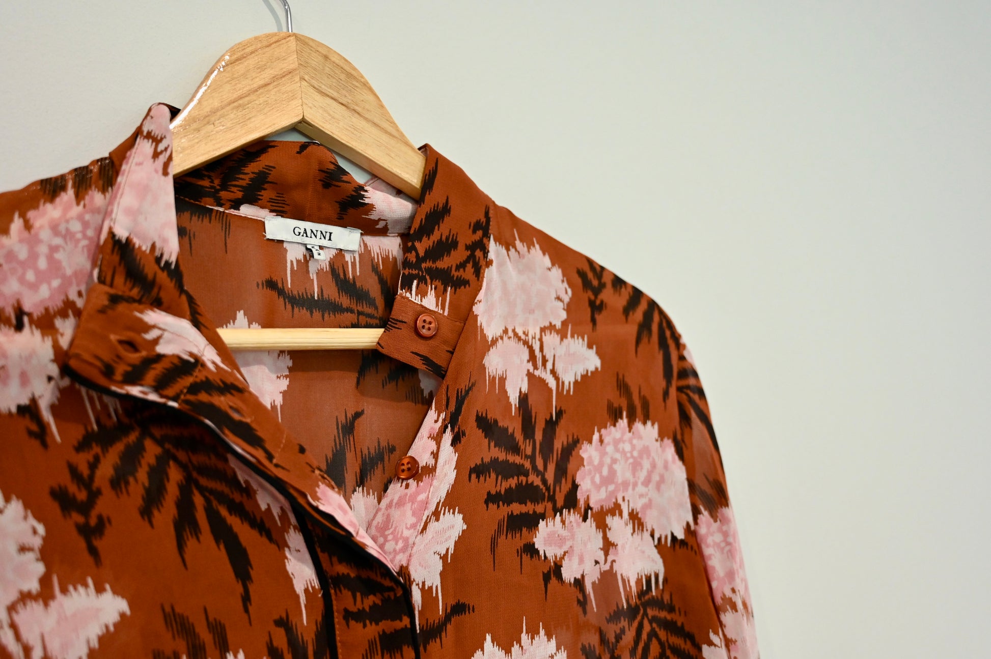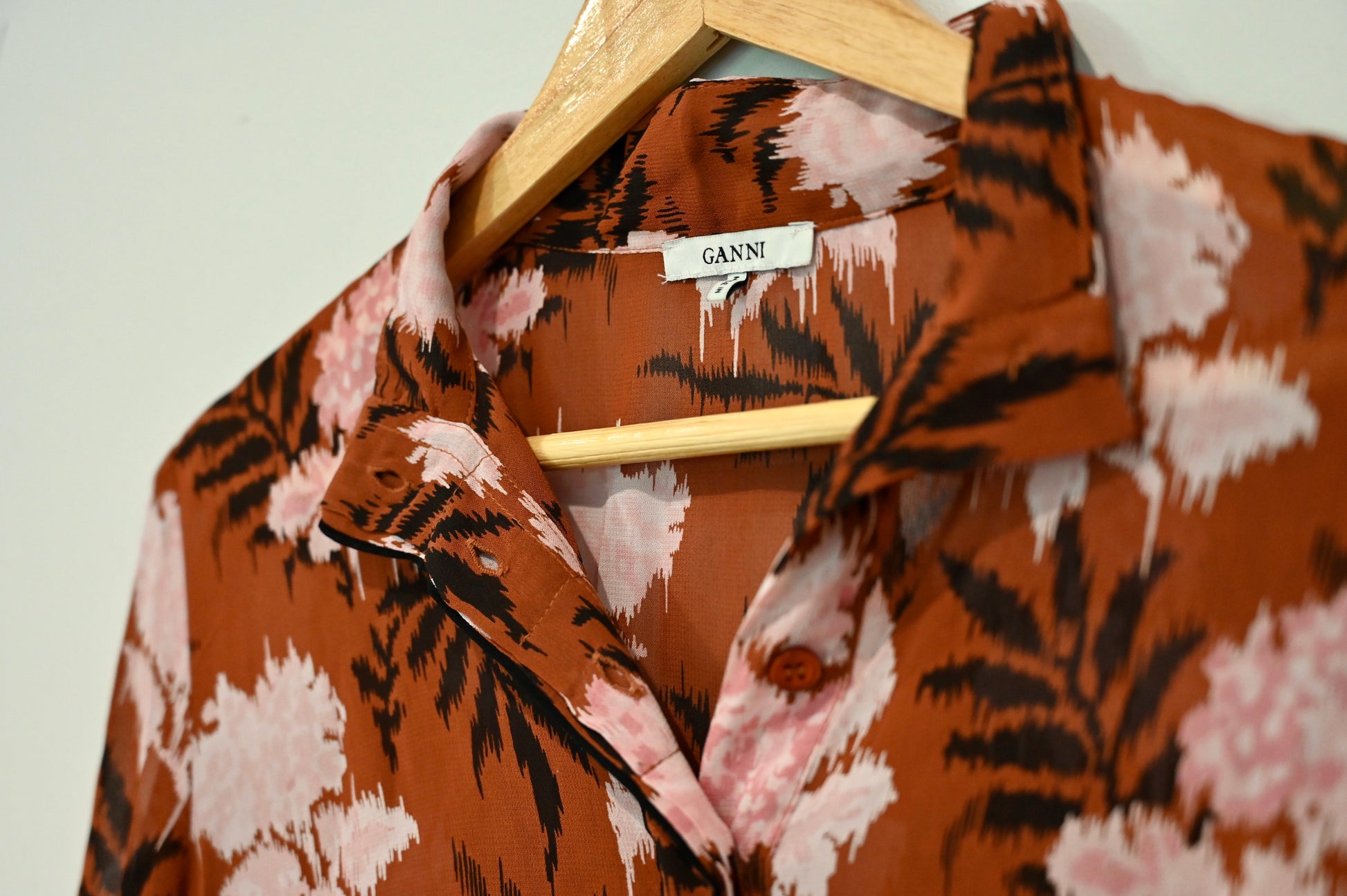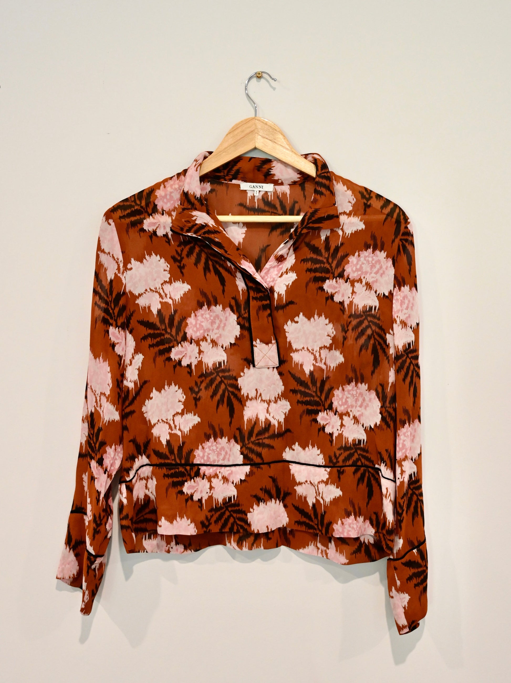 Gorgeous rusty brown Ganni blouse with pretty pale pink floral pattern. Button down to halfway at the front and black piping across the cuffs give a posh PJ feel!