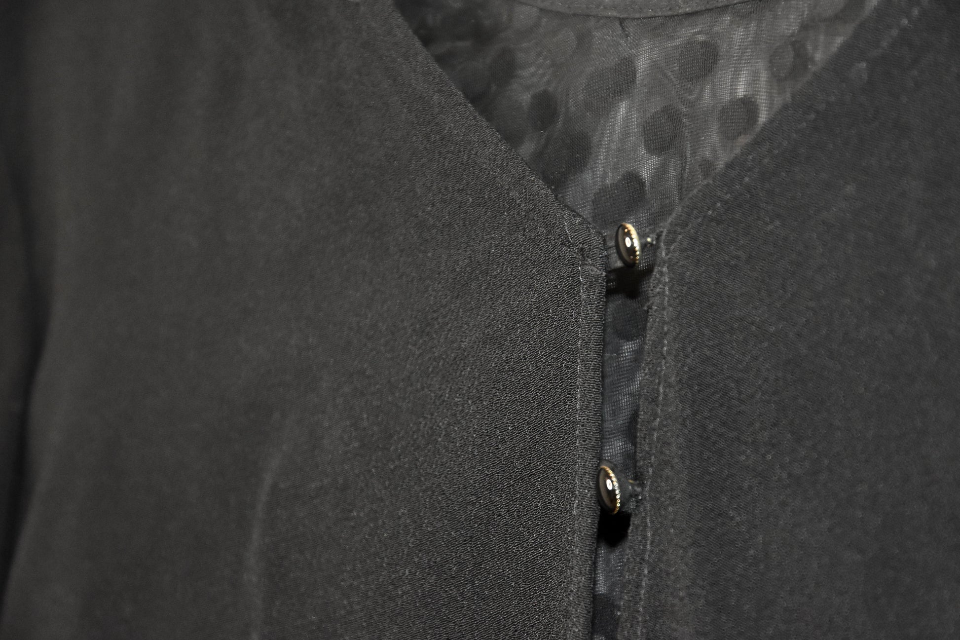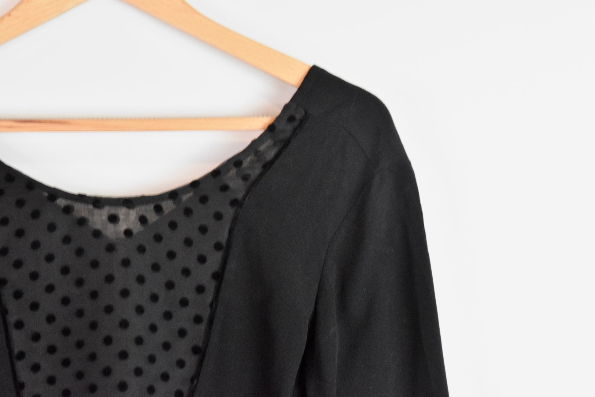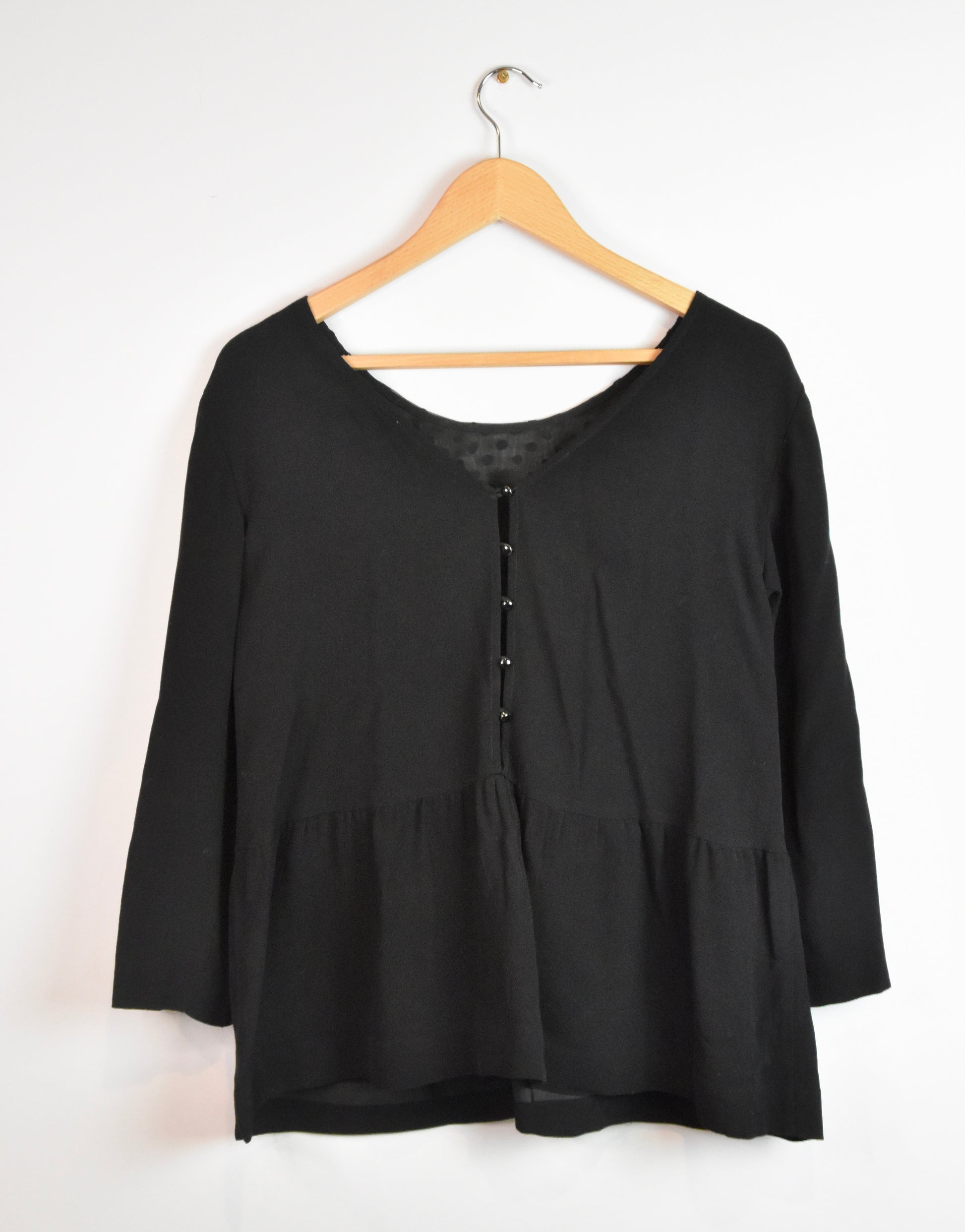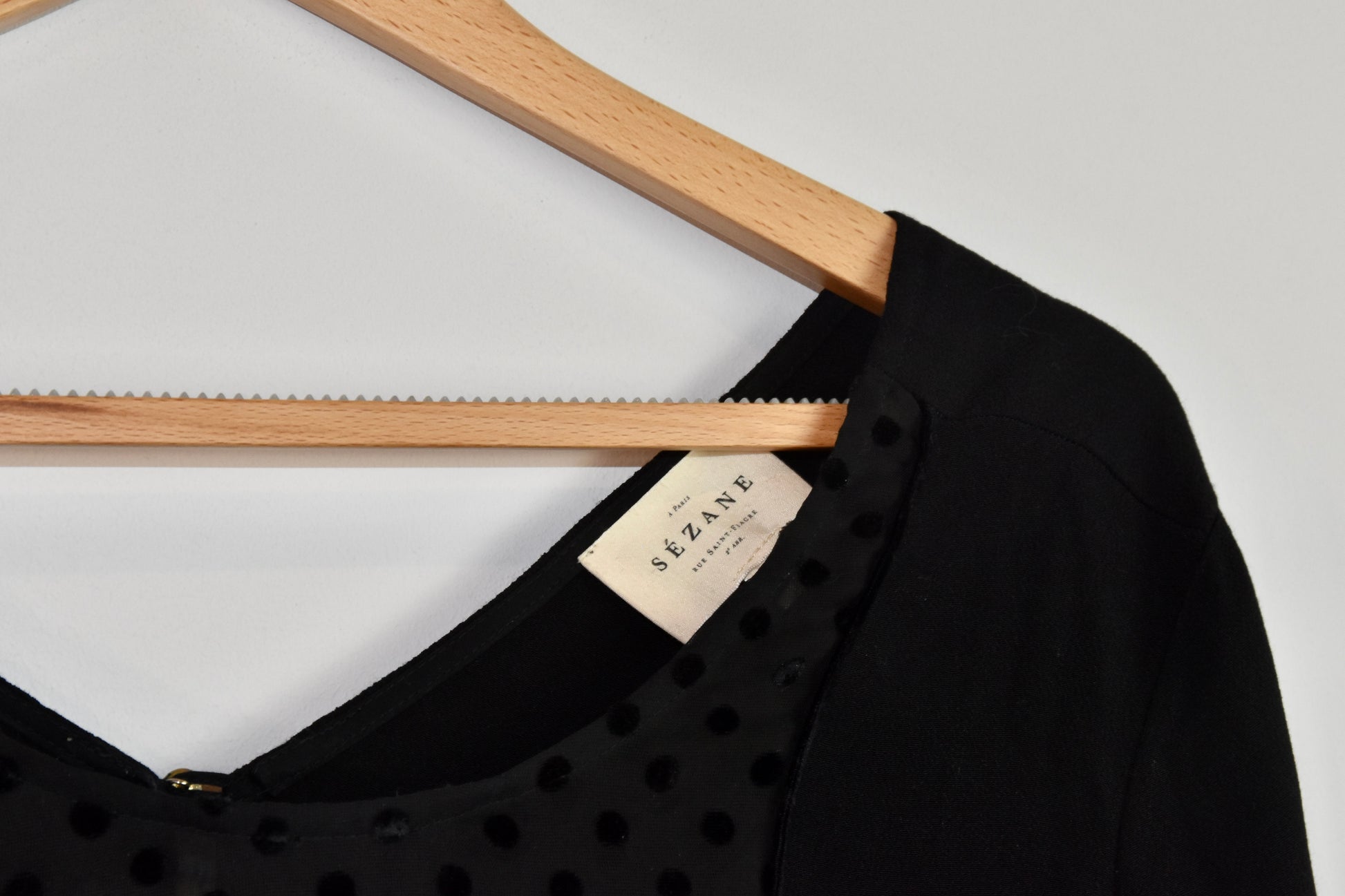 Pretty black Sézane blouse with polkadot panel in V shape down the front. Fastened at the rear with 5 buttons. Loose and flowing hem offers and elegant silhouette.