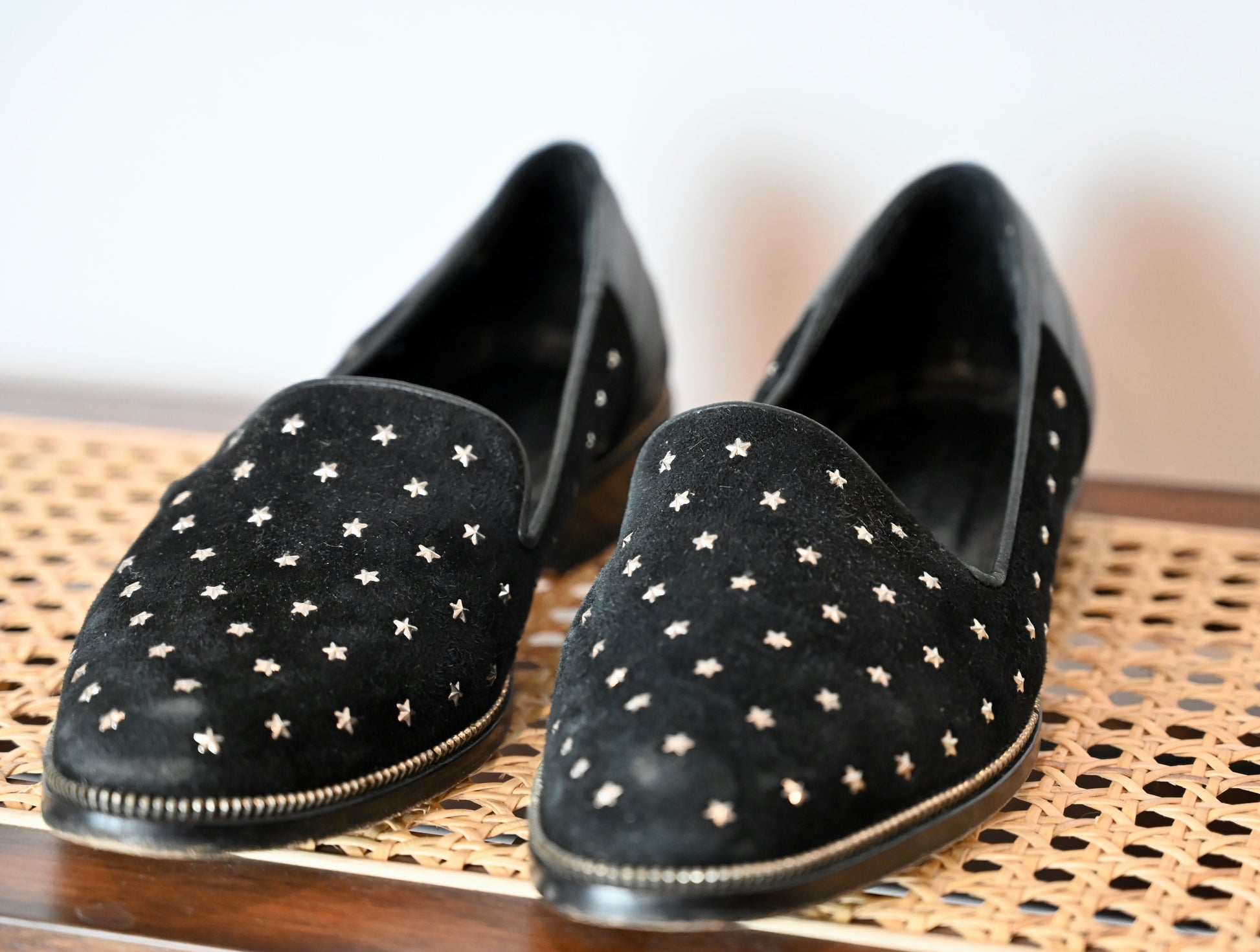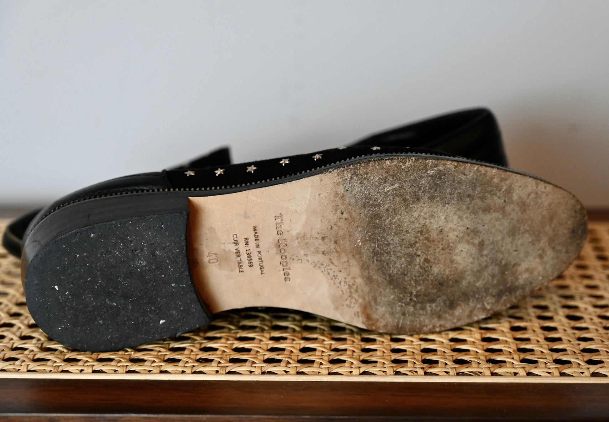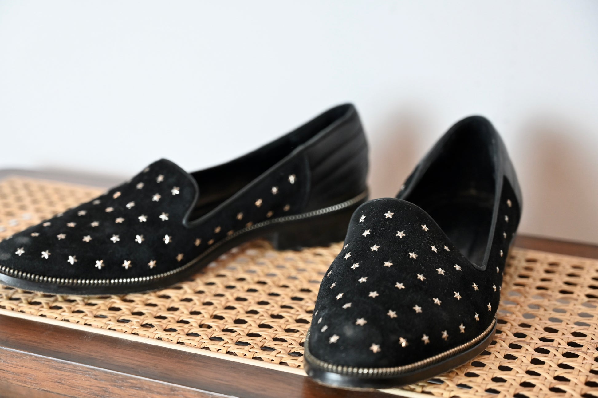 The Kooples moccasins in black leather and suede with star-shaped studs across the top and sides. Some small scuff marks on top of the suede part of the shoe.