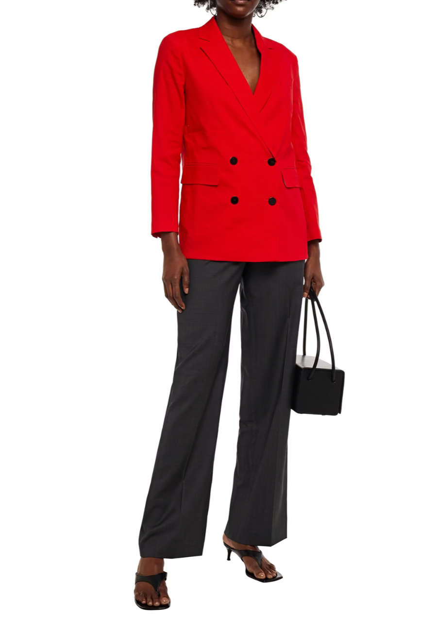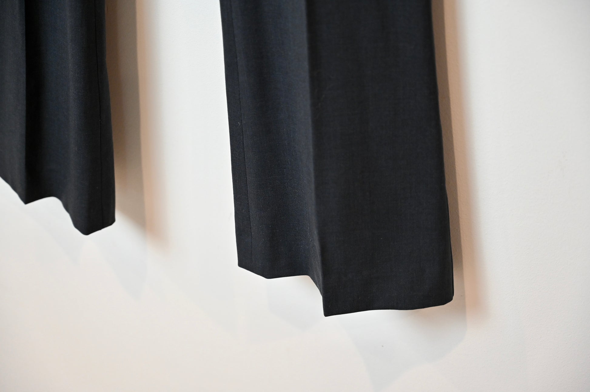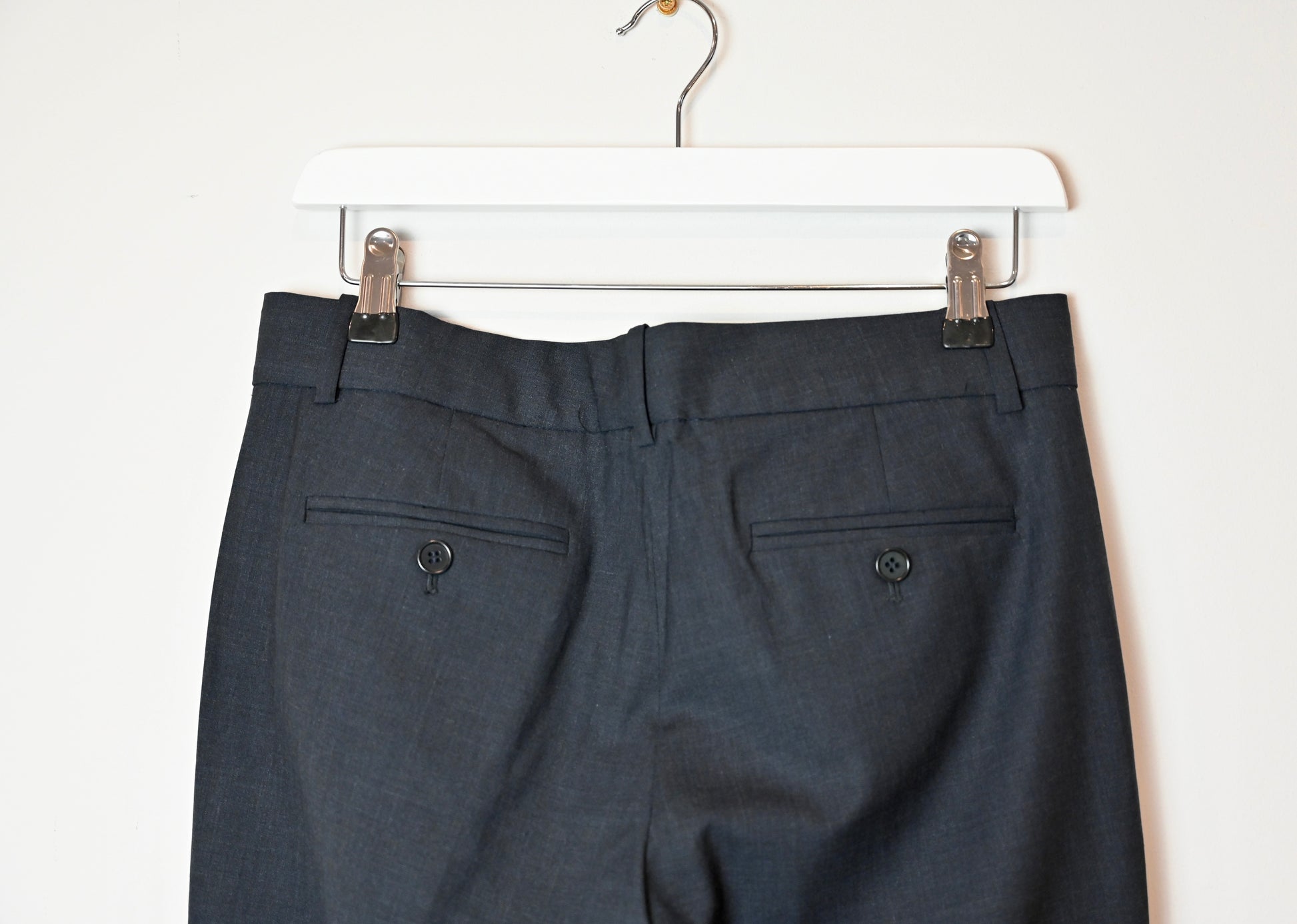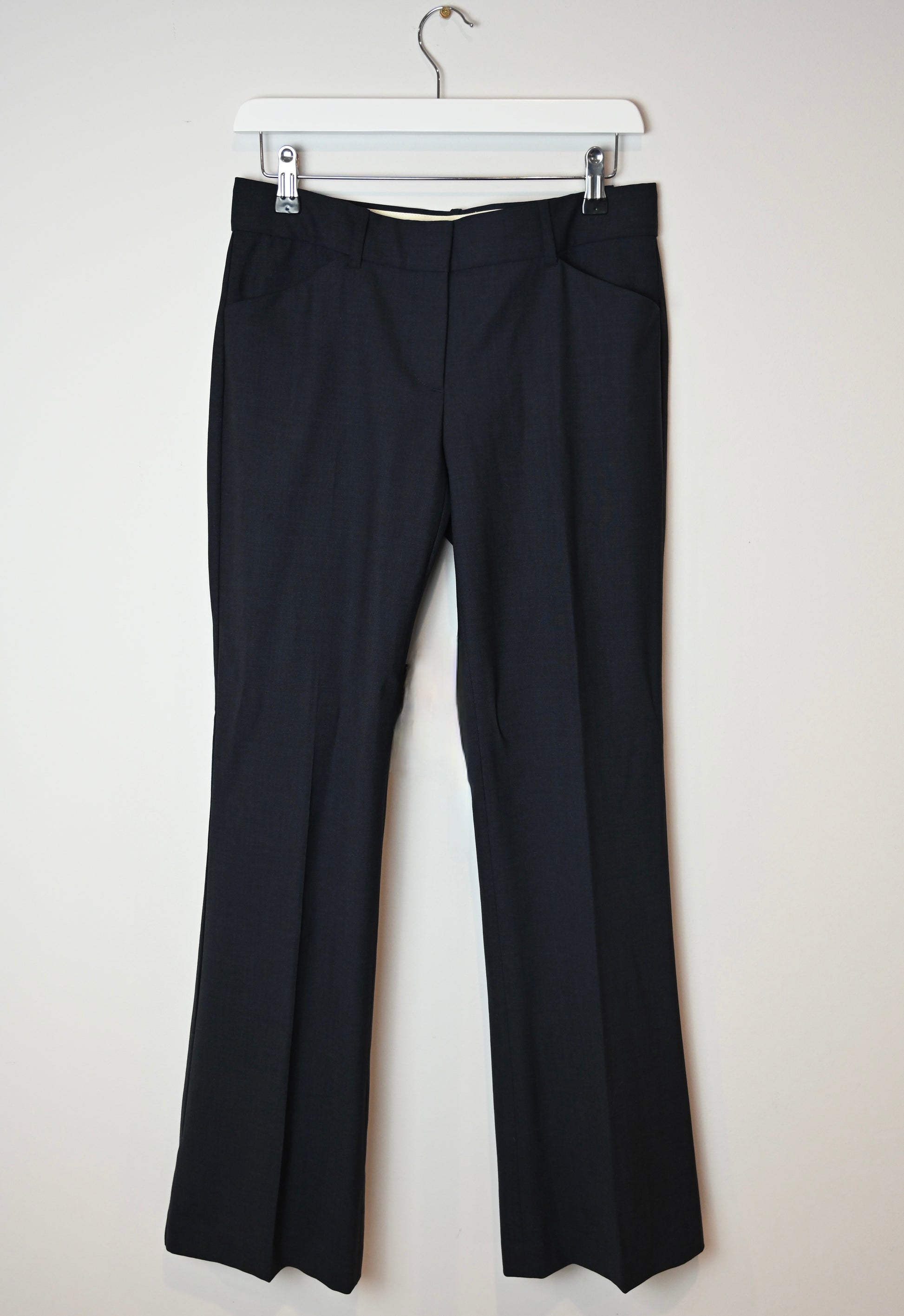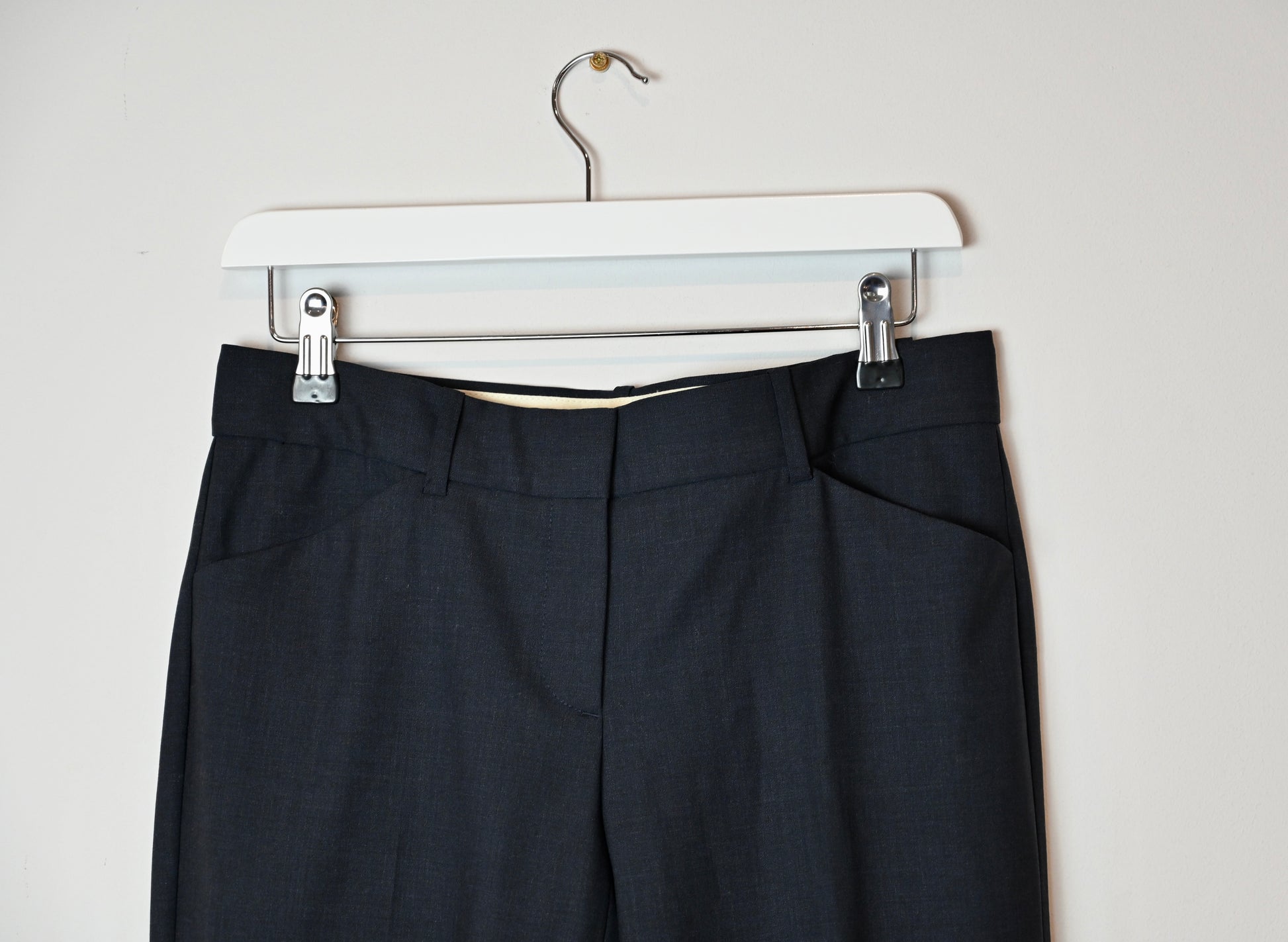 Dark grey wool wide legged trousers with pressed creases and two side slit pockets. Flattering high rise cut.